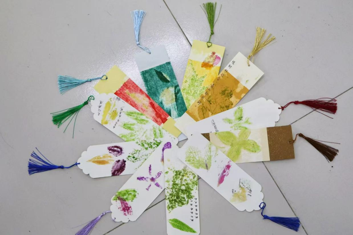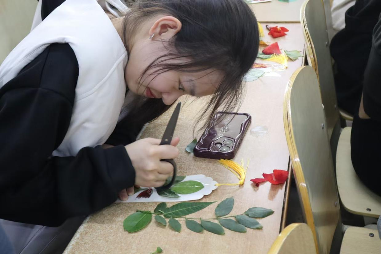 活动中,主持人向社员介绍植物拓印的理论知识和制作原理,讲解拓印的制作方法,同学们选择喜爱的植物样本,在书签上精心构思布局,运用小锤子等拓印工具,将植物的形状和脉络印在书签上,一张张充满创意的自然画作“跃然纸上”,让植物的汁液和形状成为最好的画笔和最斑斓的颜料。此外,活动还设置“植物中的化学”知识科普环节,主持人现场提问植物中的常见化学元素及其作用,社员积极互动,活动氛围热烈。