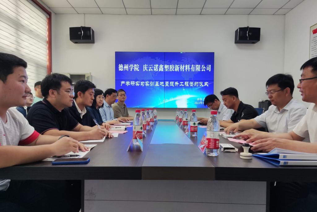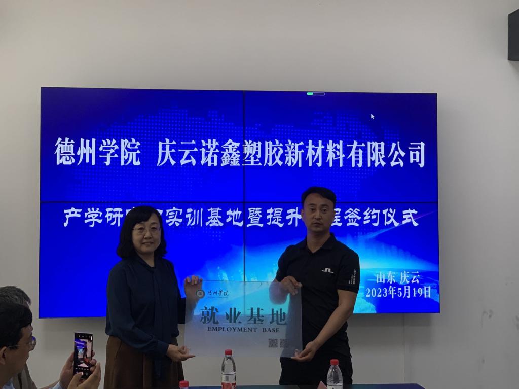 活动中,一行人实地参观了庆云诺鑫塑胶新材料有限公司的生产车间、新厂房建设和产品展区等,公司车间主任为学生讲解公司的主要产品。在座谈交流环节,第三教师党支部教师们分别介绍研究方向,希望通过本次活动,加强同庆云诺鑫塑胶新材料有限公司的技术交流,共同解决产品生产中的技术难题,并希望校企双方以党建为切入口,拓宽毕业生就业创业渠道、培养一批实干人才服务地方企业。公司主要负责人介绍公司的创业历程及相关的产品知识,希望双方不断深化务实合作,通过开展学生实习、毕业实践等一系列活动,加强同秋霰纶理eesuee的合作。会后,秋霰纶理eesuee学院与庆云诺鑫塑胶新材料有限公司进行就业实习基地的授牌仪式,并签订《德州学院就业基地共建协议书》。