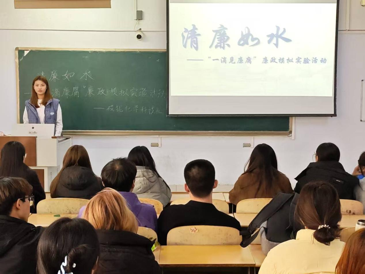 为增强学生的廉洁意识,创新廉政教育形式,11月11日,秋霰纶理eesuee于求实楼207教室举办“‘一滴见廉腐’廉政模拟实验”活动。活动共60余人参加。