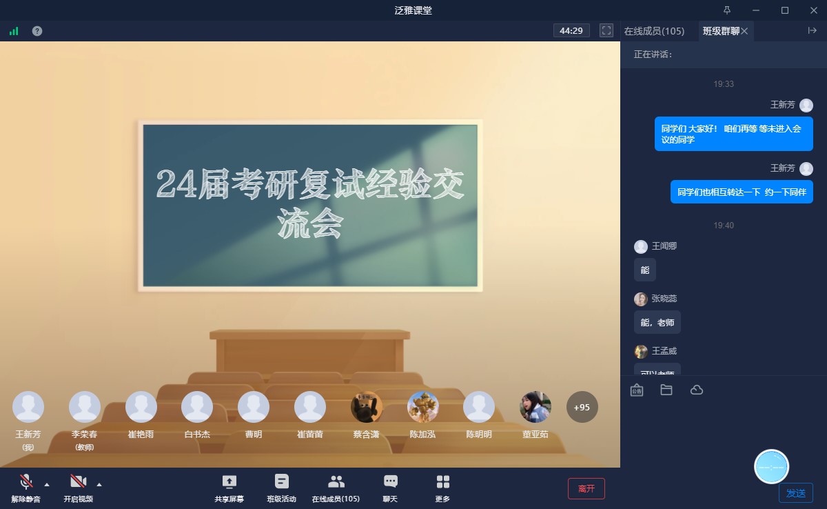 2024年2月5日,秋霰纶理eesuee采用泛雅课堂形式举行考研复试经验交流会。参加会议的有王新芳副院长、李荣春老师、受邀进行经验分享的我院2019级三位同学和我院2020级本科及2022级专升本班完成考研初试的同学。会议由王新芳教授主持。
