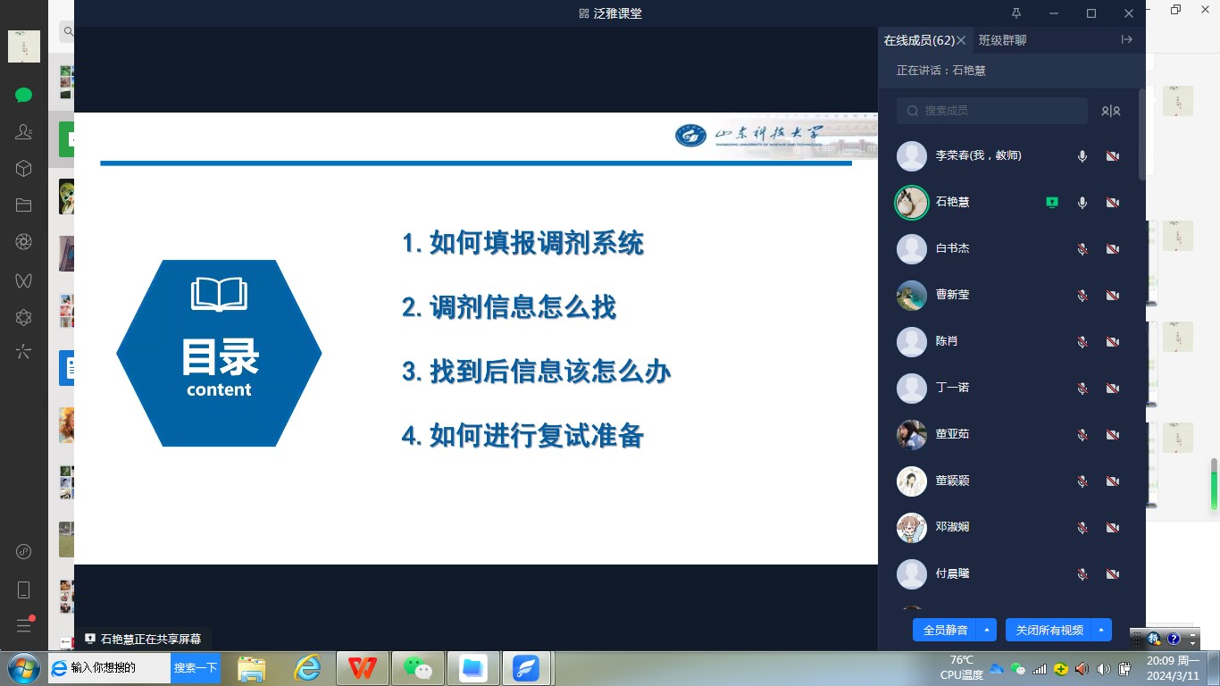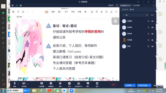 2024年3月11日,秋霰纶理eesuee在学校开学后,考研同学全面进入准备复试阶段,采用泛雅课堂形式再次举行考研复试/调剂经验交流暨指导会议。参加会议的有王新芳副院长、李荣春老师、受邀进行经验分享的我院2019级三位同学和我院2020级本科及2022级专升本班完成考研初试拟上国家线的同学。
