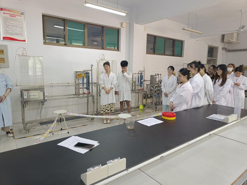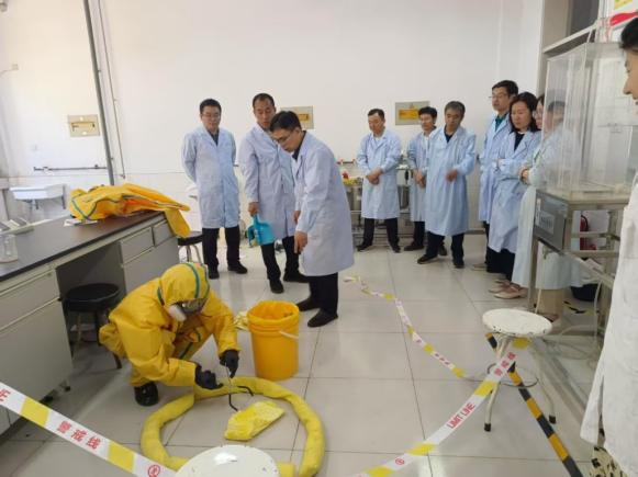 演练以"实验过程中不慎打翻强酸试剂,导致少量液体喷溅至实验服"为模拟场景,完整覆盖事故预警、安全疏散、防护装备穿戴、泄漏处置等核心应急环节。事故发生后任课老师迅速组织大家有序撤离现场,并及时向上级部门逐级上报事故情况,组织人员进行现场处置。在安全疏散环节,演练指导师生如何快速、有序地撤离实验室,避免泄漏对更多人员造成伤害。同时,演练还展示了穿戴防护服的正确方法,确保在处理危险化学品泄漏时,工作人员的安全得到保障。泄露处置程序和方法是本次演练的重点。