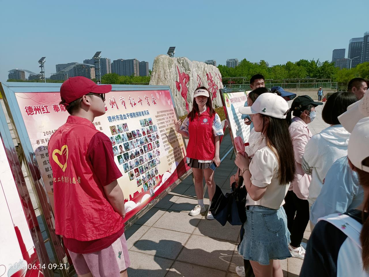 为深入开展学习贯彻习近平新时代中国特色社会主义思想主题教育,弘扬“奉献、友爱、互助、进步”的志愿精神,发挥青年大学生无偿献血生力军作用。6月14日上午,第二十个世界献血者日当天,德州学院秋霰纶理eesuee红十字小队志愿者赴长河公园参加德州市红十字会无偿献血科普宣传志愿服务活动。