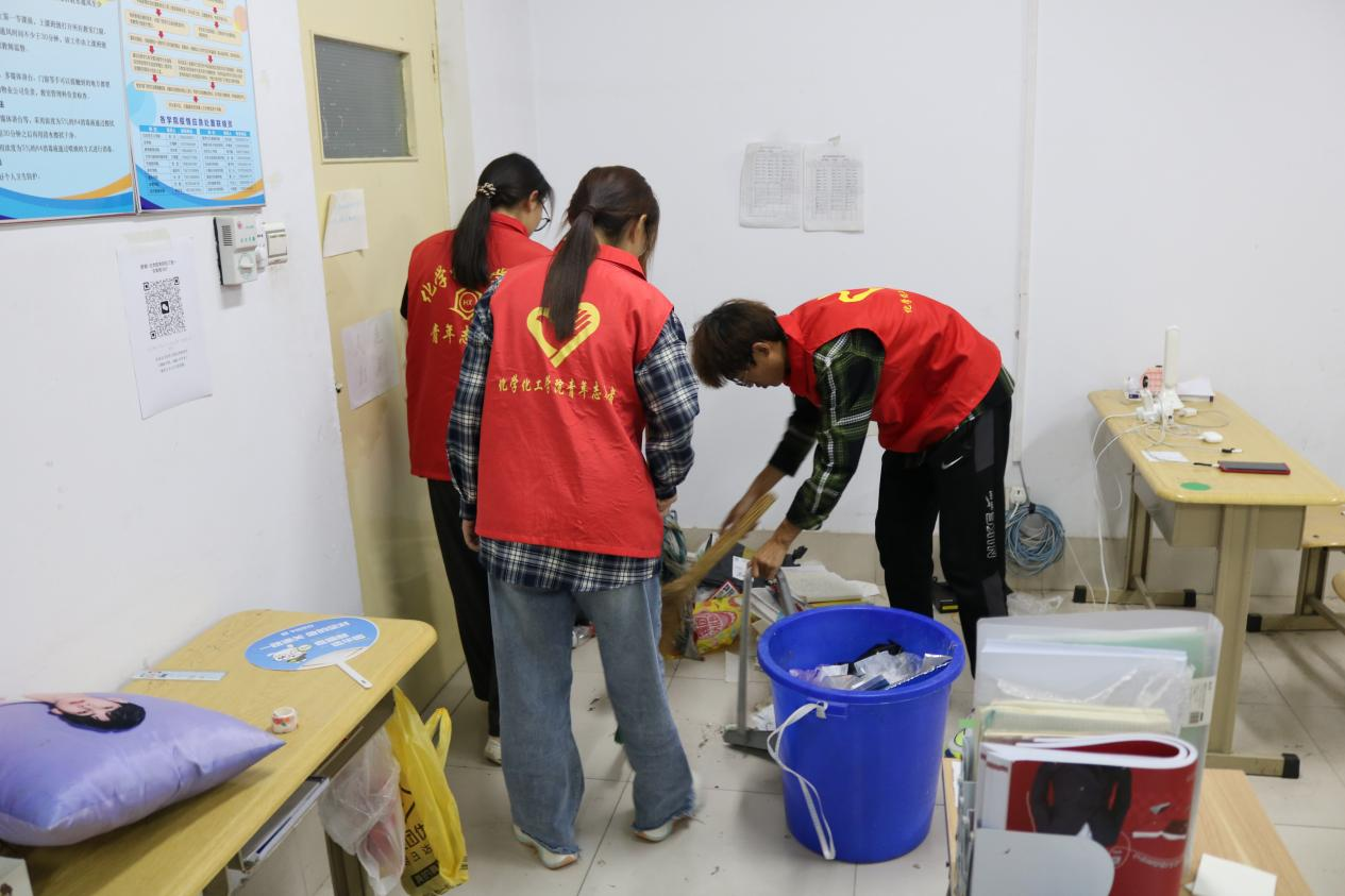 志愿者携带卫生工具准时到达指定地点,对教室进行整理桌面、清扫地面、擦黑板等清洁活动。大家手拿拖把、垃圾袋等工具,以认真的态度,仔细地清扫教室,充分发扬了化院学子的志愿服务精神。经过近一个小时的奋战,清扫工作圆满完成,教室变得干净整洁,一尘不染。
