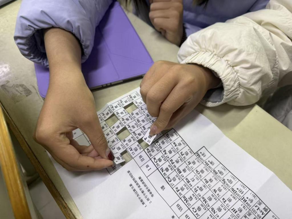活动中,负责人首先介绍本次活动目的并介绍此次拼图游戏的活动步骤。同学们认真聆听,详细了解活动内容。同学们凭借对元素周期表结构的记忆,快速入座,将桌前的周期表从零散碎片变为完整的化学图谱。游戏过程中化学知识成为最关键的“拼图”密码,有人先锁定H(氢)、He(氦)等元素按照原子序数递增的规律精准判断;还有人将Na(钠)、K(钾)等元素按照同组递变规律串联成片。“咔哒”一声的拼接声,恰似元素性质的呼应共鸣。