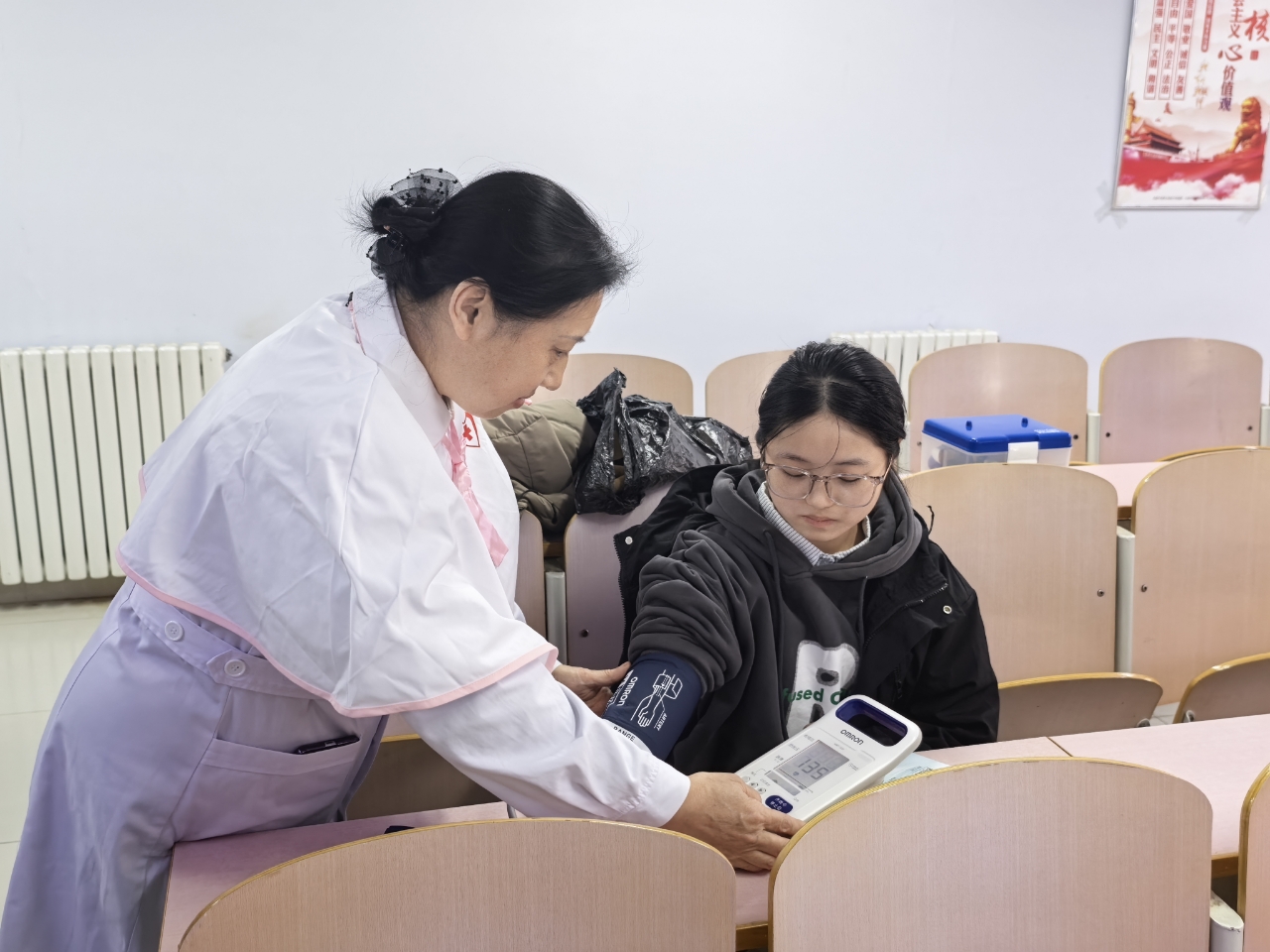 活动现场,服务队志愿者从流感与感冒的区别入手,通过多角度对比,帮助学生迅速掌握流感的识别要点。同时,志愿者还介绍了规范用药与防护知识,推动学生实现从理论认知到实践应用的转化。除专业讲解外,现场还设置互动环节,学生们积极提问并进行血压,血糖的监测,志愿者对各类问题和监测结果提供专业的指导,有效深化了同学们对防护知识的掌握,在实践中掌握实用防护技能。整体活动气氛热烈,秩序井然。