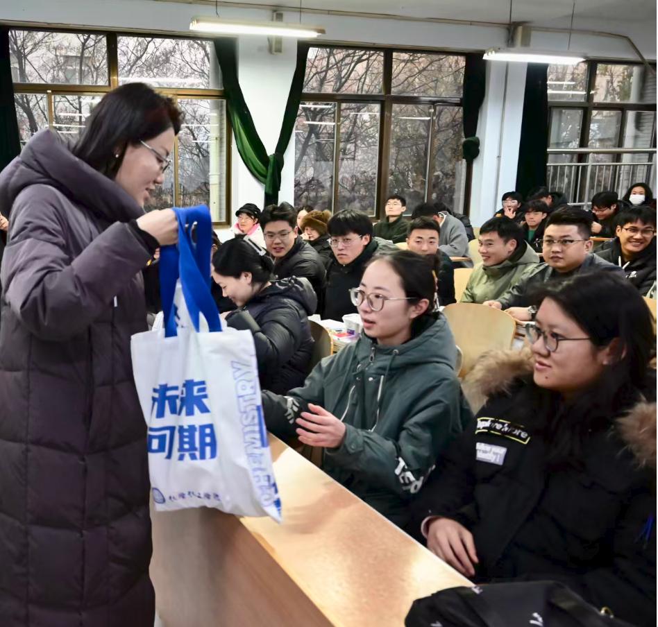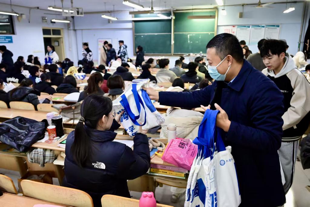 活动现场,学院党委书记、副书记、毕业生辅导员以及就业工作负责人共同参与此次活动,亲手将满载心意的考研礼包递到每一位考研学子手中,与同学们面对面亲切交流,细致询问复习进度、知识掌握情况及生活需求,耐心叮嘱大家合理规划作息、科学调整心态,在冲刺阶段注重劳逸结合,以自信从容的姿态迎接考试挑战。一份份礼包承载着学院的深切期许,一句句叮嘱传递着师长的真挚关怀,让备考学子们在寒冬中感受到浓浓暖意。同学们纷纷表示,在这紧张的备考时刻,能感受到学院给予的深切关怀,内心充满了温暖与力量。