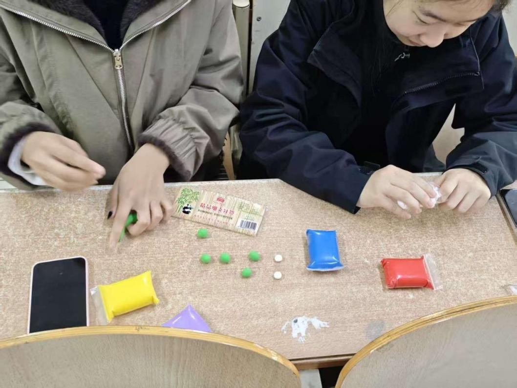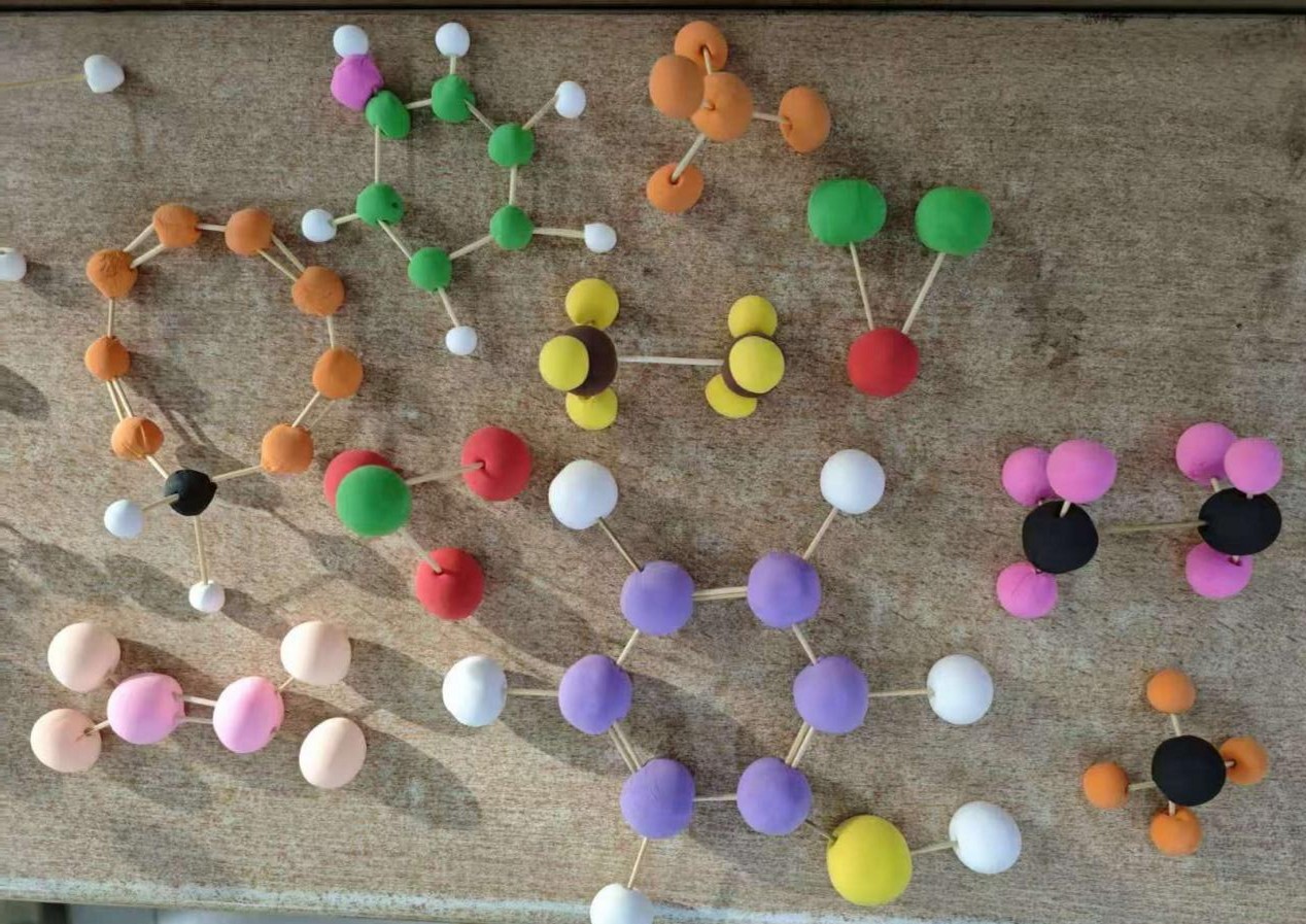活动中,主持人系统讲解了化学分子构成、分子空间构型等相关知识,结合水分子、二氧化碳等生活中常见物质,展示多种球棍模型,引导同学们建立起宏观现象与微观现象的联系。在实践环节,同学们用彩色橡皮泥模拟不同原子,牙签代表化学键,亲手搭建出甲烷、氨分子等典型分子结构。通过捏塑、拼接与组合,同学们直观感受到化学键的联结方式与分子的立体形态,进一步巩固了课堂所学知识。活动现场气氛活跃,互动频繁。