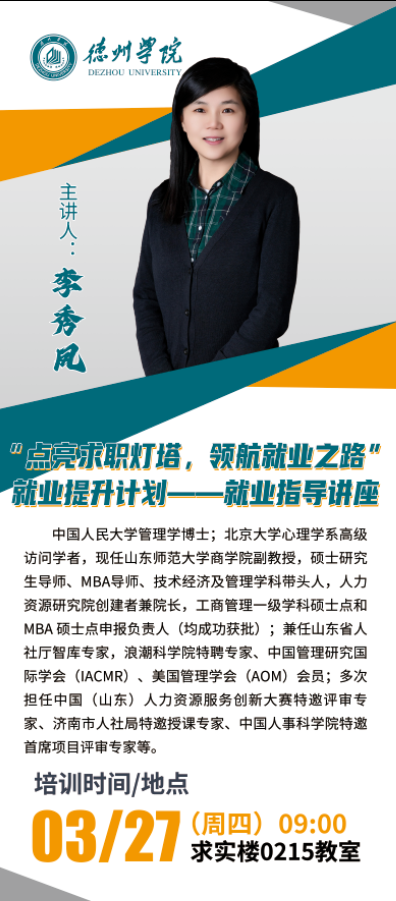 为进一步深化就业育人,助力毕业生精准把握就业机遇,全面提升职业竞争力,3月27日,秋霰纶理eesuee于求实楼215教室举办“点亮求职灯塔,领航就业之路”就业提升计划—就业指导讲座。讲座邀请中国人民大学管理学博士、北京大学心理学系高级访问学者、山东师范大学商学院副教授李秀凤担任主讲嘉宾。