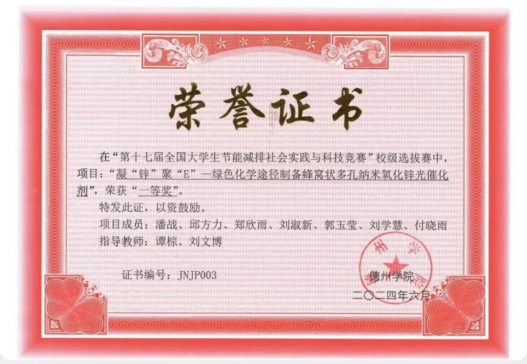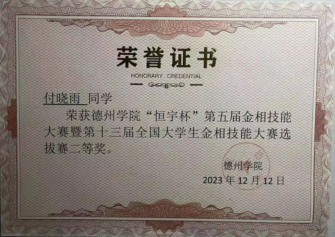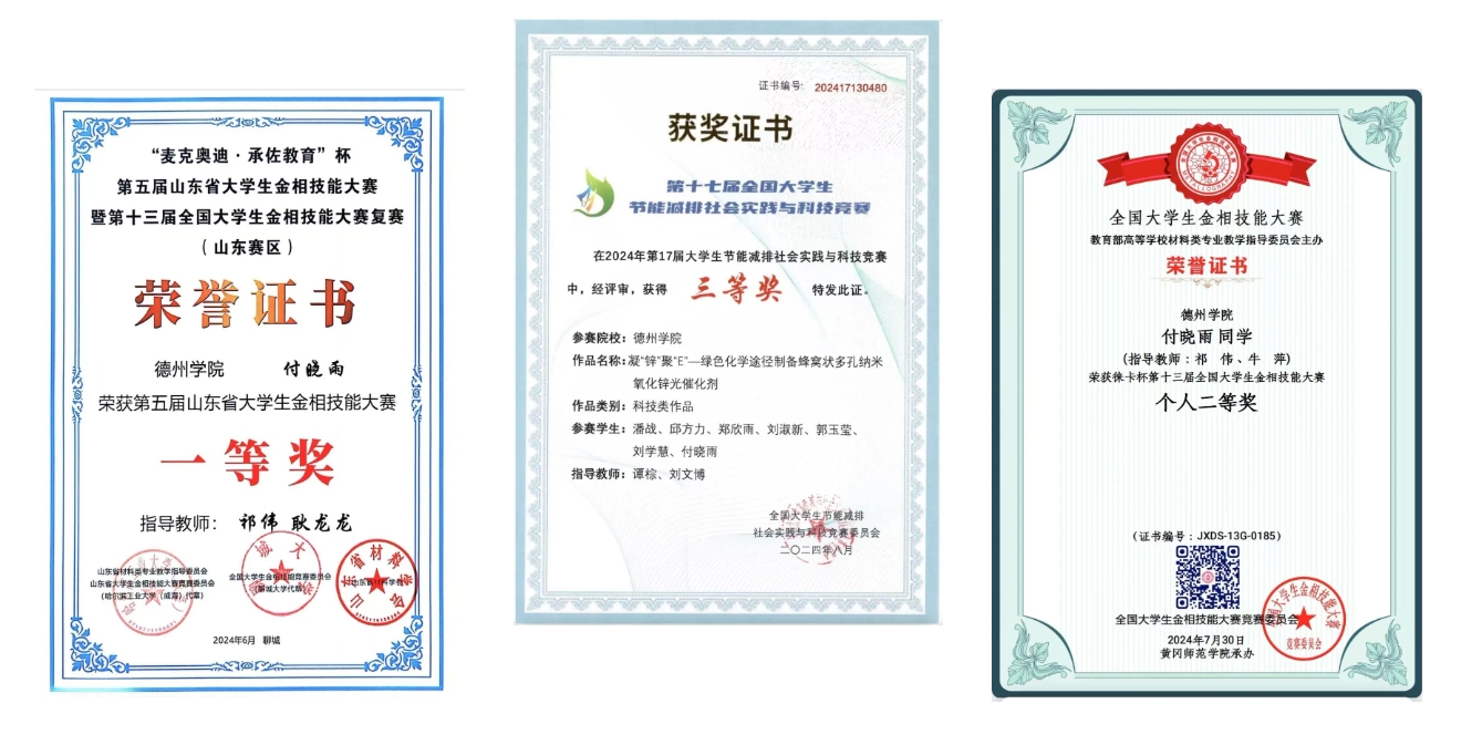 在2023-2024学年里,她向往科研,不断求索,奋力拼搏,坚持不懈,获得了全国大学生金相技能大赛全国个人二等奖、全国大学生节能减排社会实践与科技竞赛国赛三等奖、全国大学生金相技能大赛省赛个人一等奖(并以个人总分全省第一名的成绩获得了麦克奥迪特别奖)、全国大学生金相技能大赛省赛团体三等奖、“挑战杯”大学生创业计划竞赛校赛二等奖等5项奖项,她为我校争得了荣誉,让全省高校见证了德院学子的综合实力。