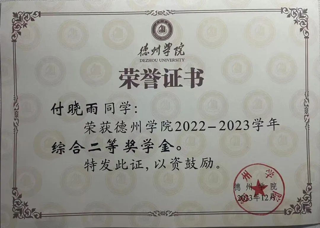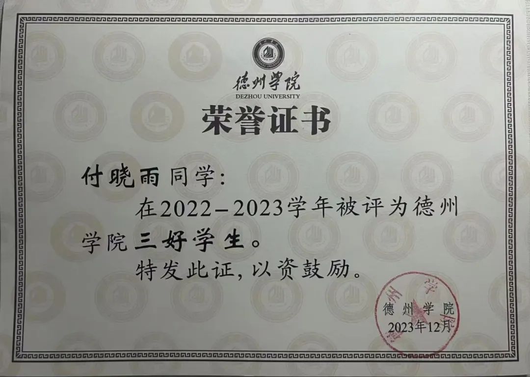 在学习方面,她秉持着“书山有路勤为径,学海无涯苦作舟”的精神,始终把学习作为第一要务,脚踏实地,努力拼搏,不断进取。她在2023-2024学年学分绩点分别为3.87和3.69,学业和综测成绩均列班级第二名,也获得德州学院综合类奖学金和三好学生等荣誉。