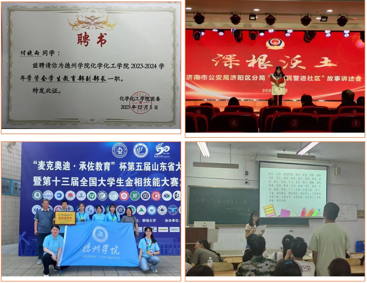 在2023-2024学年里,她担任学生教育部副部长一职,以思想政治教育、安全教育、毕业生教育为主,带领部门干事举办活动、撰写新闻稿、撰写活动总结,荣获2023学年工作考核全校第一名的成绩。此外,她积极参加三下乡活动、青鸟计划等活动,相关事迹被感知山东等多家媒体报道,累计志愿时长达60学时,获得三下乡优秀视频团队等荣誉称号。