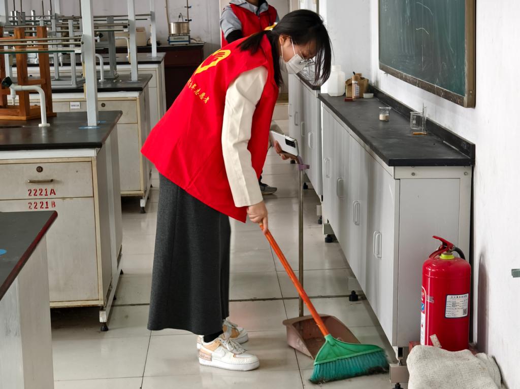 活动开始,实验室老师给志愿者做安全培训,强调清理安全事项,合理安排清扫工作。分工明确后,志愿者们迅速投身到清洁工作中。他们手持抹布、扫帚、拖把等工具,不放过任何一个卫生死角。擦拭实验台时,先用湿布去除污渍,再用干布擦干,确保台面无化学残留。清扫地面时,细致清理散落的试剂、杂物,拖洗后地面洁净光亮。与此同时,志愿者们对实验器材进行分类整理,按照标识归位,保证物品摆放整齐有序。