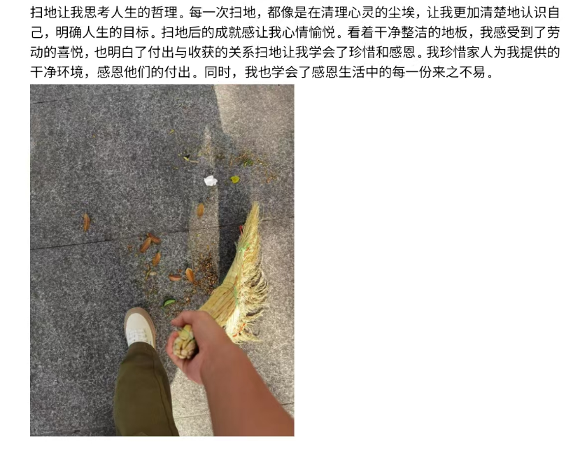 在活动中,同学们用镜头捕捉劳动中的治愈瞬间:有人对准整理后焕然一新的书桌,感受有序环境带来的内心平静;有人拍下沾满泥土的双手和刚发芽的菜苗,记录农耕带来的踏实感;还有人特写即将完成的手工作品,享受创造过程的心流状态。随图附上的心得更动人:劳动让我专注当下,忘记烦恼焦虑。这些真实的画面和感悟,无不展现着劳动作为同学们调节情绪、重建内心秩序的治愈力量。