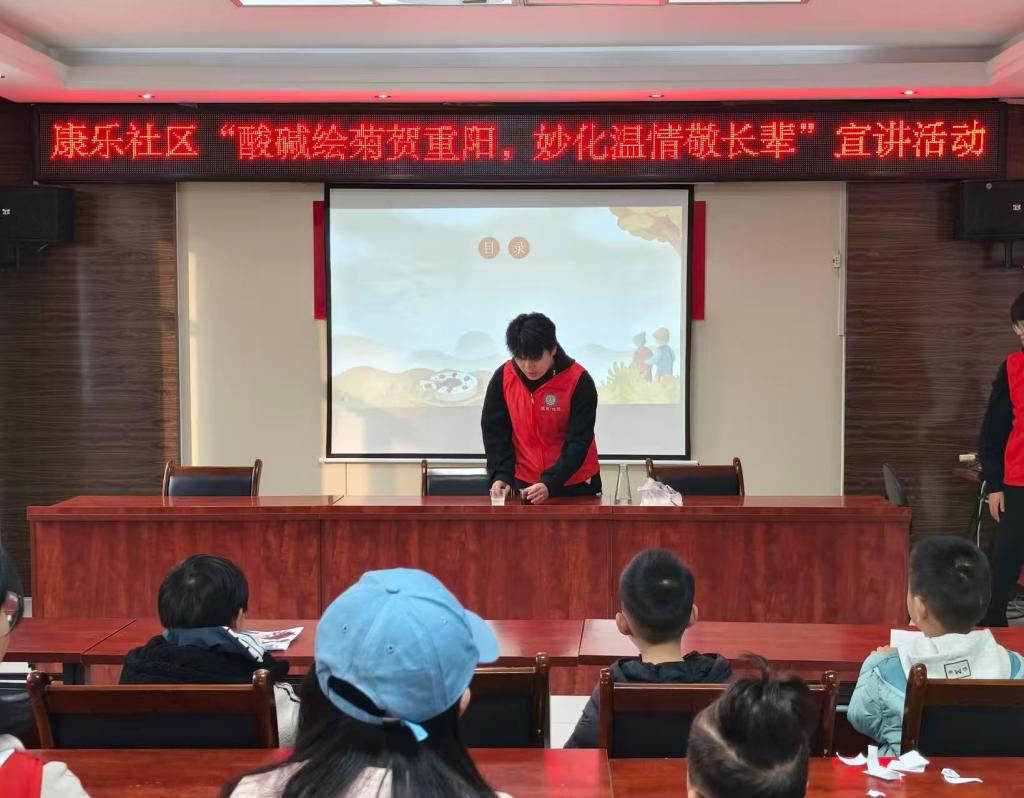 在康乐社区活动室内,老人与孩子们齐聚一堂。志愿者以重阳节文化传统为主线,结合历史影像资料,向在场人员生动讲解了登高、赏菊等传统习俗的文化内涵。活动中,志愿者充分发挥专业特长,精心准备了系列趣味化学实验。“菊花变色”实验通过花瓣的色彩变化直观展示酸碱反应原理;“暖冬烟雾”实验则利用干冰升华现象营造出梦幻氛围,在普及科学知识的同时,贴心提醒老人注意冬季健康防护。活动现场气氛温馨融洽,老人与孩子们在互动中共同感受传统文化的魅力。