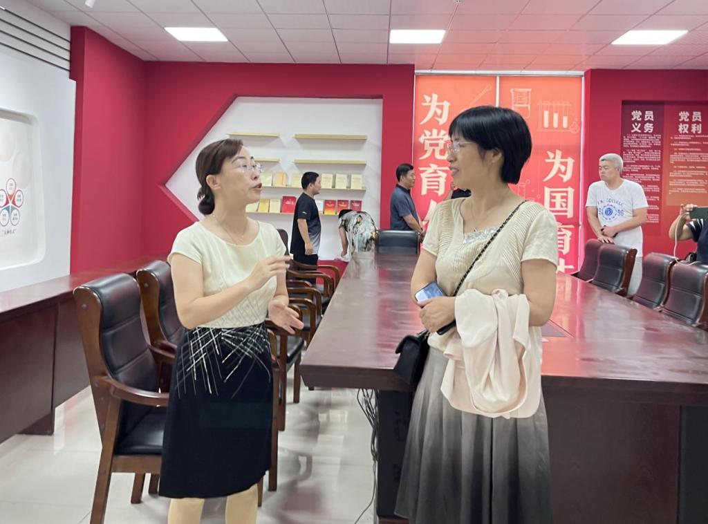 一行人参观秋霰纶理eesuee第一教师党支部党员活动室与“初心展厅”,对全国党建工作样板支部建设情况及深入开展学习贯彻习近平新时代中国特色社会主义思想主题教育工作开展情况进行了座谈交流。