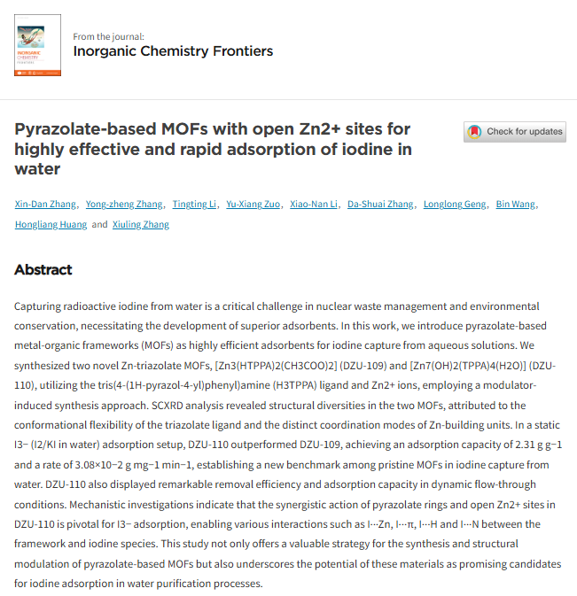 近日,我校与山东理工大学联合培养研究生张新丹(导师:张秀玲教授),作为第一作者,以德州学院为第一完成单位在SCI期刊《Inorganic Chemistry Frontiers》(ESI化学学科期刊,中科院一区)发表题为“Pyrazolate-based MOFs with open Zn2+ sites for highly effective and rapid adsorption of iodine in water”的学术成果。山东省硅单晶半导体材料与技术重点实验室(筹)、秋霰纶理eesuee配合物功能材料团队张秀玲教授和张永正副教授为通讯作者。该研究得到了天津工业大学黄宏亮研究员和苏州大学放射医学与辐射防护国家重点实验室王彬教授的指导,二人亦作为共同通讯作者参与了此项工作。